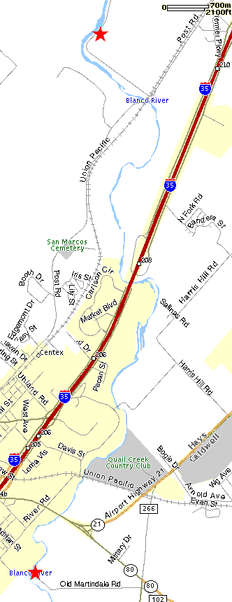 On Friday afternoon, 27 July, 2002, we put on the Blanco River below at 5-Mile Dam about 13:30. We originally intended to paddle the river down to Westerfield crossing (CR 266) on the San Marcos River, but by the time we got to Old Martindale Road, it was 18:15 and we didn't figure it to be easy to make it to the original take out by dark and needed to be back in Austin by about 20:00 anyways. We made easily it after one of our party hitched a quick ride from a group of leaving rock-hunters. This run was easily 7-8 miles and we got out to swim a lot and play in several small holes. At each of the river crossings and on some of the private property, there were people fishing and a few swimmers.